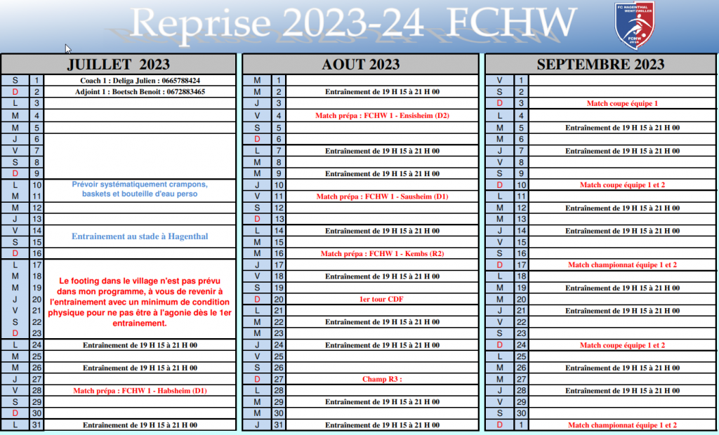 Saison 2023 – 2024 ; planning de reprise estivale !